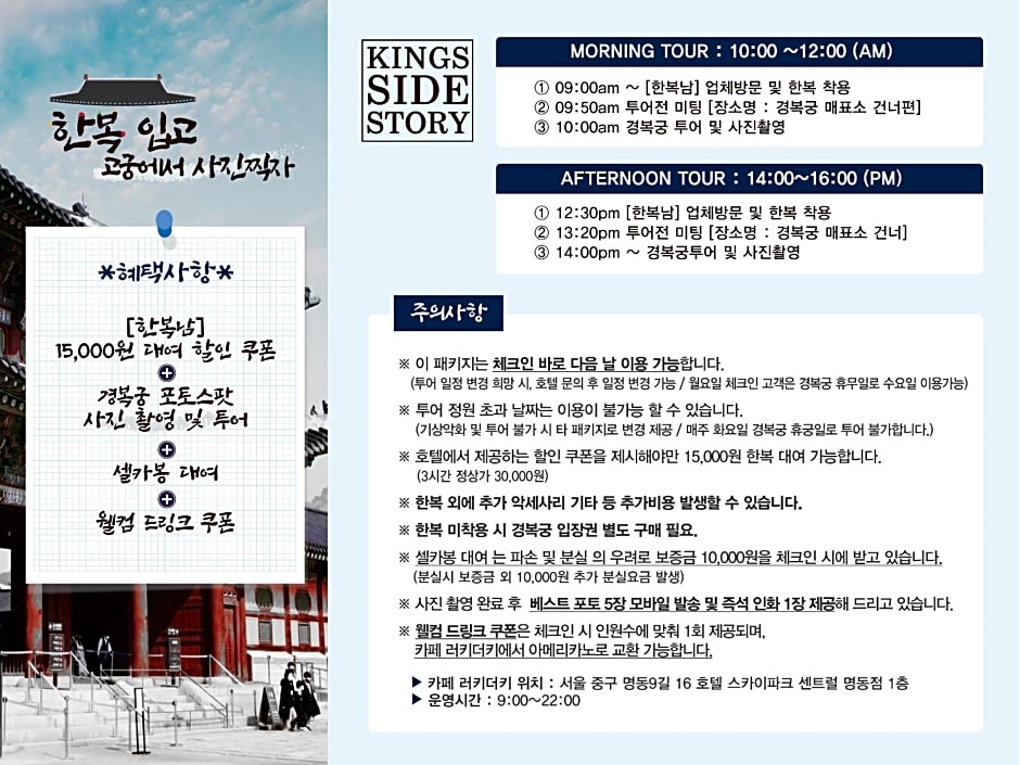 Palace Tour Package is per stay. Package includes : - [Hanboknam] Hanbok Rental 50% Discount Voucher - Gyeongbokgung Palace Photospot Snapshots and Tour - Selfiestick rental - Welcome Drink ( Americano) - K-POP Photocard Please refer to additional information through image.